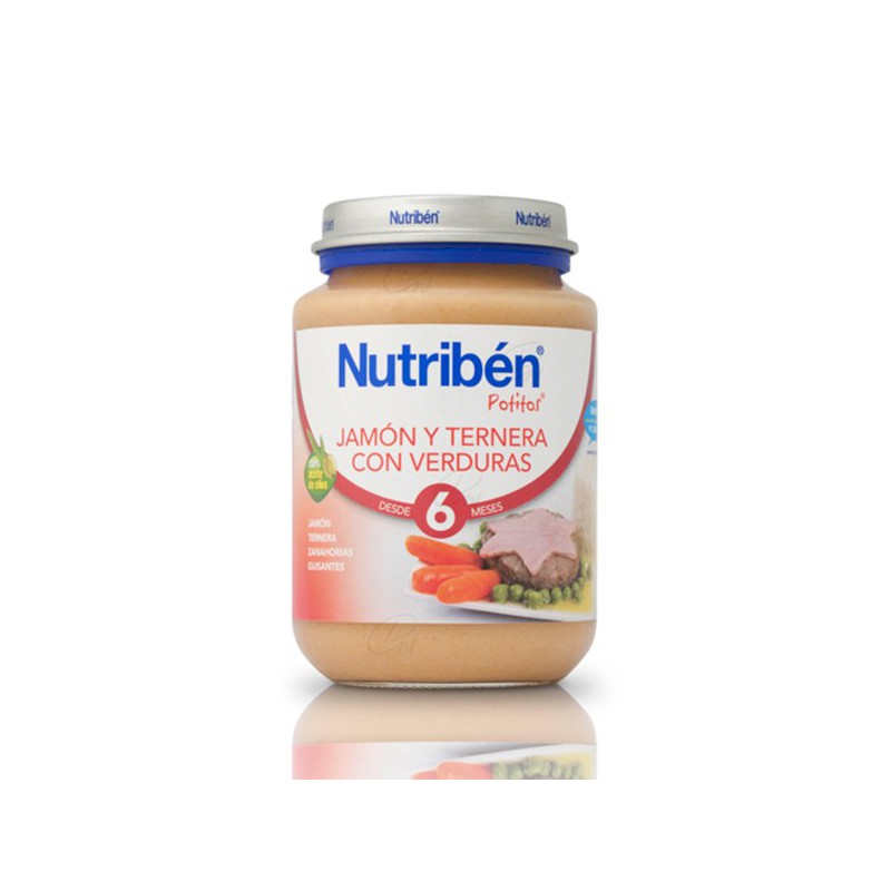La calidad de este potito se garantiza durante los 3 años posteriores desde la fecha de producción siempre y cuando el almacenaje sea correcto. Leche desnatada (33%), agua de cocción, jamón y ternera (14,5%), verduras (9,7%)(zanahorias y guisantes), arroz (6%), almidón de maíz, aceite de oliva (0,5%) y cebolla. Nutribén® Jamón-ternera con verduras es un alimento infantil destinado para niños a partir del 6º mes.