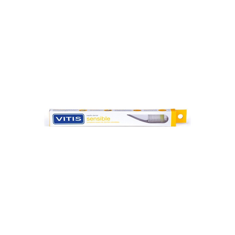 Cepillo dental para dientes y encías sensibles. Mango anatómico, cabezal de pequeño tamaño, filamentos redondeados y texturizados, capuchón protector.