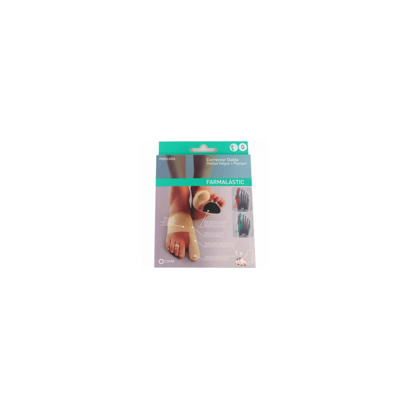 Corregir y limitar la evolución del juanete (Hallux Valgus), aliviando los dolores articulares y los ocasionados por el roce. Evitar y aliviar los dolores plantares del antepie debidos a envejecimiento o desgaste de la almohadilla plantar natural del pie, durezas, etc. El corrector doble patentado, a diferencia de los correctors rígidos, se utiliza durante la jornada gracias a su diseño flexible y ultra-fino. Realinea el 1er dedo del pie de forma regulable y también el 1er metatarsiano, a la vez que ayuda a aliviar el dolor, tanto articular como por roce en el juanete y la zona metatarsiana. Llevándolo a diario con cualquier tipo de calzado, no sólo corrige y ayuda a aliviar el dolor, también limita la progresión del juanete. Silicona 56% Poliamida/elastano 44% Producto sanitario. Clase I.